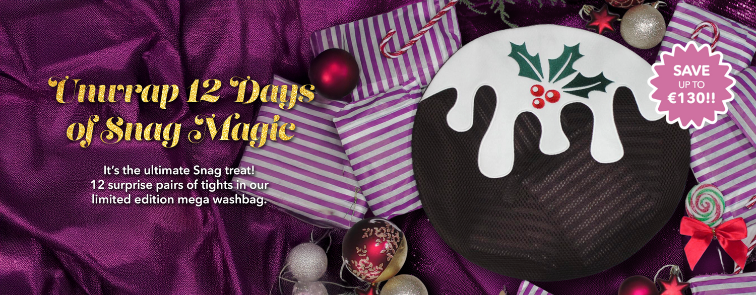 For det første en helt ny vaskepose med julebudding i megastørrelse. For det andet 12 mystiske par af vores superbehagelige strømpebukser. Strømpebukserne er håndplukket af vores Snag Elves fra alle vores tidligere kollektioner, så det, du får, er en total overraskelse!