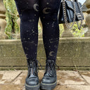 Vi søgte, hvor sløret er tyndest, for at finde Hallow-queen stjerne- og månestrømpebukser. Som et billedtæppe vævet af kosmos danser konstellationer af sølvglitterstjerner og halvmåner hen over benene og glimter langs den lilla tågebund. Træd ind i det himmelske med de perfekte hekse-strømpebukser, der er så bløde, behagelige og virkelig passer.