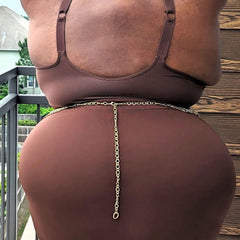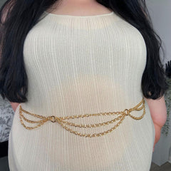 Strål med Gaia Body Jewellery. Denne guldkæde til taljen har tre kæder, der er forbundet med holdbare O-ringe. Den har en lås bagpå, så den kan justeres til en personlig pasform og kan bæres højere på taljen eller lavere på hofterne. Den er holdbar og brusebestandig, perfekt til at bære over tøj eller badetøj, og leveres i en mærket støvpose, så den kan opbevares sikkert.