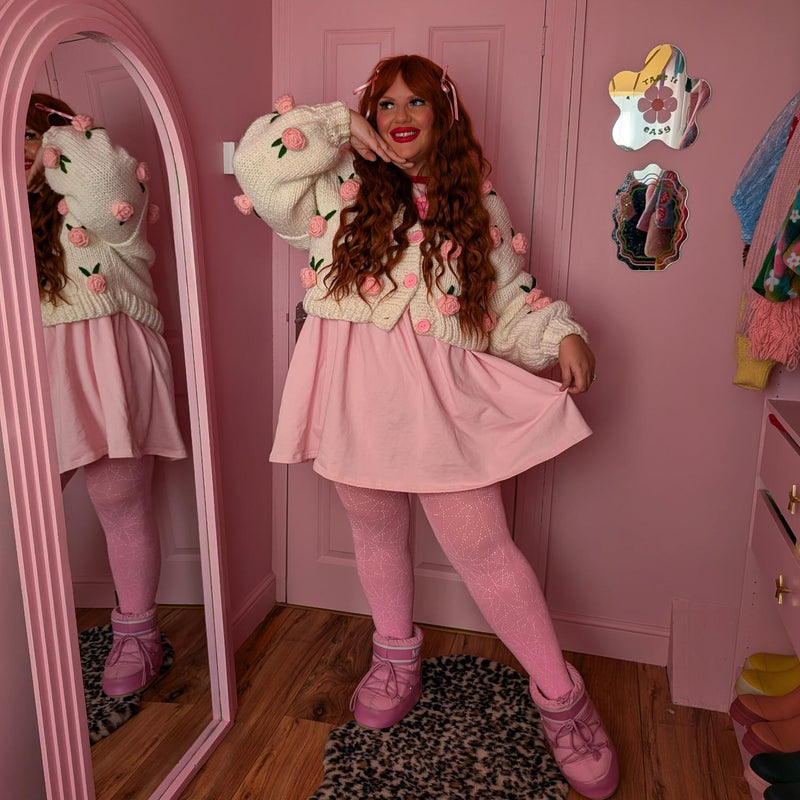 Træd ind i den søde vintermagi med Star Map, vores drømmende 80 denier strømpebukser i blødt Angel Delight pastellrosa drysset med delikate hvide geometriske prikkeklumper. Ved første øjekast ligner mønsteret spredt stjernestøv, men kig lidt nærmere, og du vil se, at prikkerne samler sig og danner skinnende trekanter og krystalagtige former. Det er delvist vinterfrost, delvist galakse-stjernekort og delvist festlig cupcake-glimmer, alt sammen strikket sømløst sammen til et par hyggelige strømpebukser.