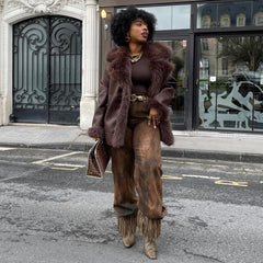 Gør dig klar til at falde pladask for Amelia Aviator-jakken i brun imiteret pels. Denne længere aviator-jakke er fremstillet af glat vegansk PU-imiteret læder i den smukkeste dybe brune farve og foret fra krave til forneden med den blødeste og mest behagelige imiterede pels, vi nogensinde har skabt. Et enkelt tryk, og du vil forstå, hvorfor denne jakke føles som ren luksus, der omslutter dig.