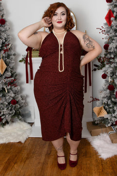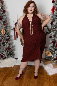 Blænd igennem festsæsonen med Bordeaux Lurex Halter Dress, dit hemmelige våben med masser af glimmer. Dyb bordeauxrød lurex skinner som gløgg under lyskæder, mens silkebløde bindestropper smyger sig om halsen og giver en tilpasset pasform, der aldrig strammer. Dans fra den første julesang til den sidste nedtælling uden en eneste justering.