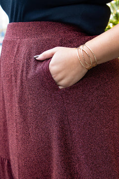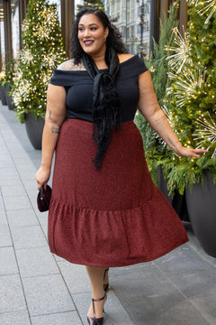 Sving dig ud på dansegulvet med Bordeaux Lurex Tiered Midi Skirt, din festlige favorit, der er klar til at snurre rundt. Dyb bordeaux lurex glitrer på ydersiden som gløgg under lyskæder og falder i et slankt hovedlag, før en legesyg nedre flæse giver bevægelse og sjov. Flæsen falder lavere bagpå for at forlænge benene og indramme hvert skridt i ubesværet glamour.
