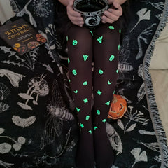 Lad den ægte halloween-ånd skinne med Glowsty - vores første UV-reaktive strømpebukser nogensinde, der bringer uhyggen direkte til dine ben! Med et uhyggeligt godt design på forsiden af benene med spøgelser, græskar, stjerner og kranier, skal du være i nærheden af en UV-lygte for at se, hvordan disse uhyggelige mønstre bliver levende i mørket.