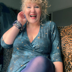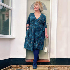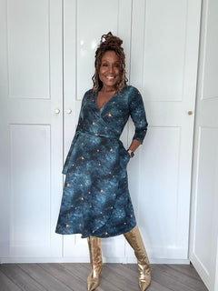 Drej dig ind i eventyret og mød Nebula Wrap Dress. Den er fremstillet af vores luksuriøse bomuldsjersey i det eksklusive Nebula Stars-print med hvirvlende pletter i dyb blå og turkis, drysset med gyldne stjerner.