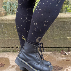 Hallow-queen son las medias perfectas para lucir un look brujesco. Una base negra de 80 deniers con un diseño de luna y estrellas de ensueño en purpurina dorada. Perfectas para todo el año gracias a su tejido transpirable. No se clavan, no se enrollan ni se caen. Lo suficientemente discretas como para llevarlas en cualquier ocasión, son una joya oculta que no puede faltar en tu colección de medias.