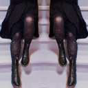 Hemos buscado donde el velo es más fino para encontrar las mallas Hallow-queen de estrellas y lunas. Como un tapiz tejido con el cosmos, constelaciones de estrellas plateadas y lunas crecientes danzan por las piernas, brillando a lo largo de la base de neblina púrpura. Adéntrate en lo celestial con las medias de bruja perfectas, tan suaves, cómodas y realmente ajustadas.