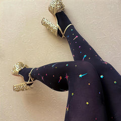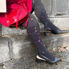 Te presentamos StarFall, las medias negras de 80 deniers que convierten tus piernas en un brillante cielo nocturno. Salpicadas de estrellas multicolores y divertidas estelas de cometas, estas medias son caprichosas, alegres y totalmente únicas. Atrevidas y elegantes a la vez, añaden un toque celestial a vestidos, faldas o cómodos jerseys de invierno.