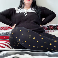 Ya conoces a Dasher y a Prancer... ¡pero Blitzen brilla con la misma intensidad! Estas son las mallas navideñas de estrellas perfectas, con una base negra clásica que tiene estrellas de lámina dorada esparcidas por las piernas como un cielo nocturno escarchado. Estas mallas de 80 deniers traen la magia navideña, pero sin una nariz roja a la vista. ¿Quién necesita juegos de renos cuando tienes este tipo de brillo?
