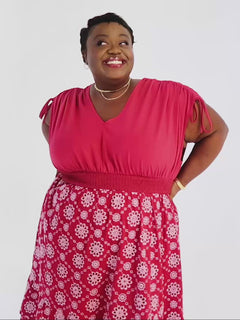 Lo hemos diseñado con todo lujo de detalles. Tiene una cómoda cintura elástica que facilita el ajuste y un escote en pico por delante y por detrás. Las mangas cortas presentan un elegante fruncido ajustable en las costuras de los hombros, rematado con un clásico detalle de lazo. Y, por supuesto, hemos incluido nuestros profundos y prácticos bolsillos laterales.