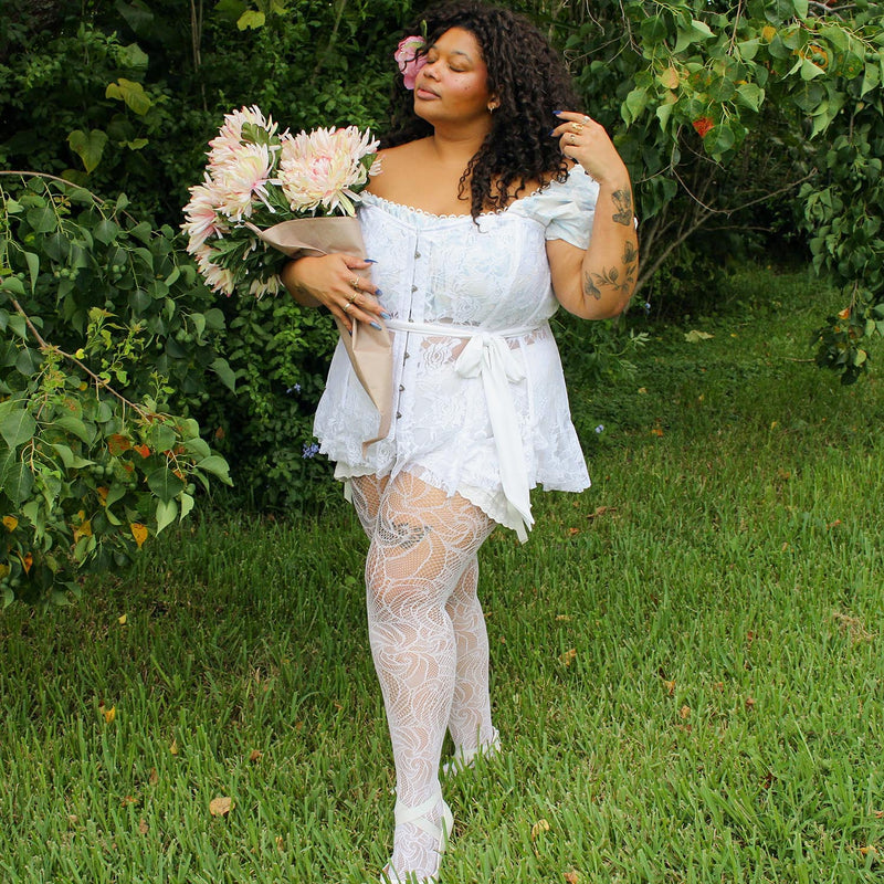 Mima tus piernas con nuestras medias de rejilla blancas Time Warp, con un increíble diseño de rejilla de encaje arremolinado desde los dedos de los pies hasta la cintura.