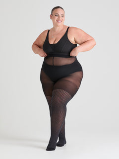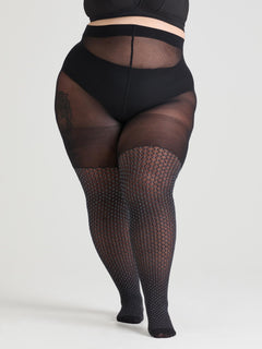 Digamos que estas medias son un poco inesperadas. Los leotardos de purpurina Bob son todo chispa, picante y todo bonito. Un poco misteriosas, un poco picantes, las Bob tienen una parte superior negra transparente y un brillante diseño Blackadder twinkle en la parte inferior de las piernas, crean un efecto de muslo falso que es súper glamuroso.