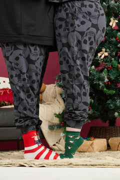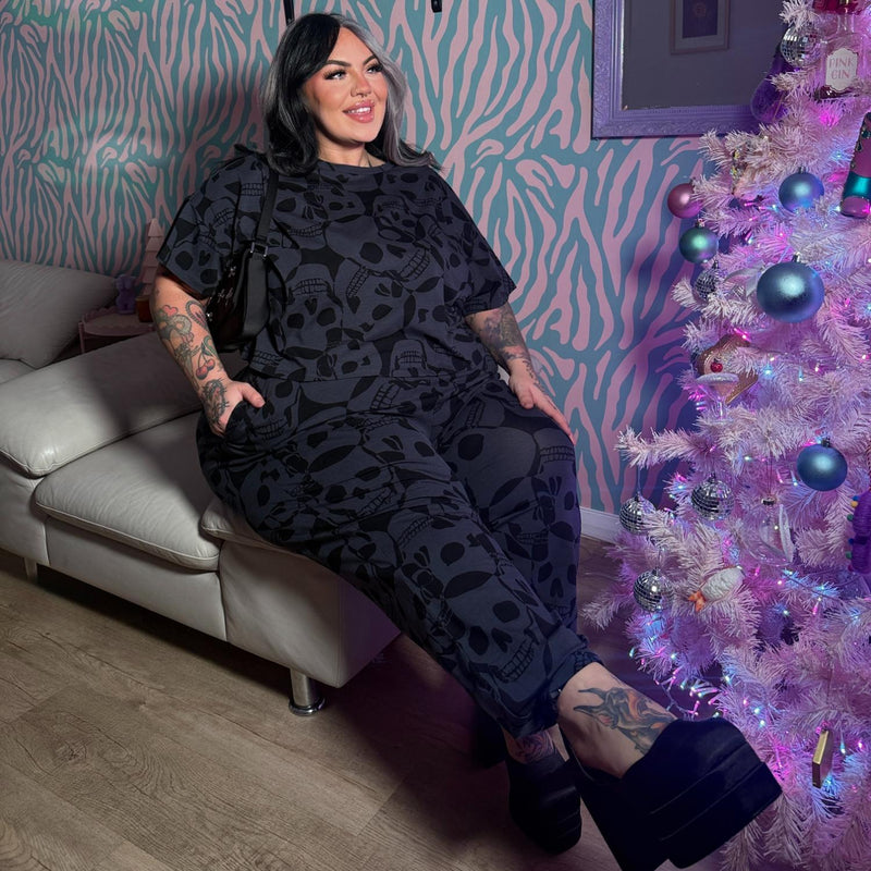 Cientos de calaveras sonrientes se arremolinan sobre una base de tinta, aportando la energía vampírica adecuada. El conjunto incluye nuestra nueva camiseta cuadrada de manga corta, recortada justo por encima del ombligo para que se adapte perfectamente a los pantalones de cintura alta (sin espacios fríos). El pantalón tiene un puño en el tobillo y una cómoda cintura elástica con cordón que se siente como el más suave abrazo de medianoche.