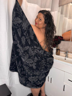 Perfecta nada más salir de la ducha, después de un chapuzón o para una noche de mimos con velas y todo lo demás. El hilo de algodón 100% es suave incluso para las pieles más sensibles, transpirable y duradero. Vamos, regálate algo un poco oscuro, un poco floral y mucho más fabuloso.