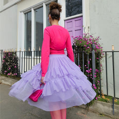 Hay días que piden un toque dramático. Hay días que piden delicadeza. Esta falda ofrece ambas cosas. La falda de malla en color lavanda transmite esa sensación de ligereza y vaporosidad que hace que todo parezca un poco más mágico. Sus tres capas de suave malla se mueven contigo, reflejando la luz y creando esa silueta natural y etérea que convierte los momentos cotidianos en algo especial.