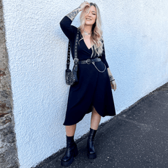Hemos dado a los vestidos envolventes el tratamiento Snag . Diseñado para adaptarse a nuestra gama de tallas inclusivas y tener un aspecto increíble, este vestido negro es un verdadero wrap, con un cinturón elástico cosido y proporciones generosas para que envuelva todo el cuerpo. Está confeccionado en algodón suave y transpirable, tiene un dobladillo curvado, mangas elásticas 3/4 y bolsillos profundos y funcionales. Se puede llevar durante todo el año y se puede combinar para cualquier ocasión. Además, queda genial con los leotardos Snag .