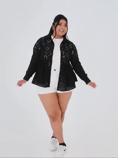 À la fois chemise et veste, c'est la couche supérieure idéale pour les journées chaudes. Confectionné en coton léger avec une broderie Anglaise sur tout le corps, il est conçu pour être porté à votre guise : ouvert sur un caraco et un short pour un look décontracté, ou boutonné comme un haut classique.