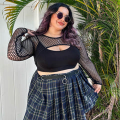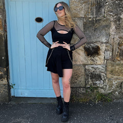 J'ai une main dans ma poche et l'autre tendue vers Alanis en noir, le plus beau top en résille cropped. Il s'agit d'une combinaison de boléro en résille et de camisole en jersey cropped, cousus ensemble pour rester toujours en place. Le dessous de poitrine est élastiqué et les bords sont extensibles, ce qui le rend très confortable et évite de s'enfoncer sous les aisselles. Il est à manches longues, existe en neuf tailles et a une allure épique tout au long de la journée.