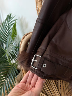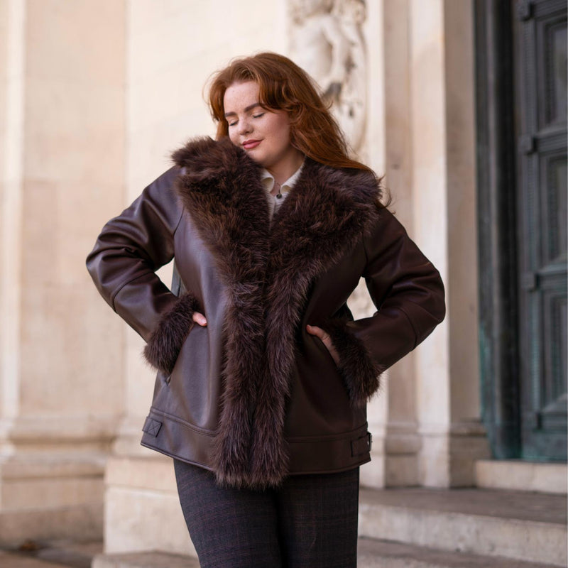 Préparez-vous à craquer pour la veste Amelia Aviator en fausse fourrure marron. Cette veste aviateur longue est confectionnée dans un cuir synthétique vegan lisse d'un magnifique marron foncé, puis doublée du col à l'ourlet dans la fausse fourrure la plus douce et la plus confortable que nous ayons jamais créée. Il suffit d'un seul contact pour comprendre pourquoi cette veste vous enveloppe d'un sentiment de pur luxe.