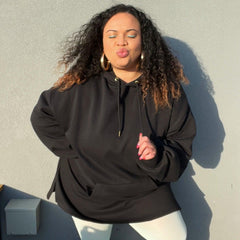 Ce sweat à capuche long classique noir est un basique confortable à porter tous les jours. Fabriqués dans le molleton le plus doux, ces sweats à capuche changent vraiment la donne et sont super confortables et agréables à porter. La coupe décontractée et la poche avant généreuse sont parfaites pour se prélasser, avec de jolis détails de découpe au niveau des pouces, d'élégantes ferrures dorées et suffisamment de tissu pour couvrir vos fesses.