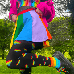 Portez votre cœur sur vos jambes ! Ces collants joliment tricotés présentent un motif de cœur arc-en-ciel, inspiré du drapeau de la fierté LGBTQ+.
