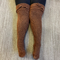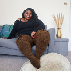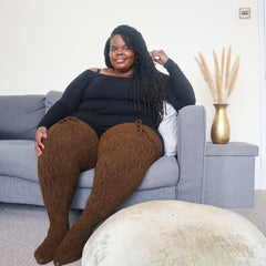 Faites plaisir à vos cuisses avec nos luxueuses chaussettes tricotées à hauteur des cuisses, dans un riche chocolat chaud marron. Confortables, douillettes et incroyablement douces, ces chaussettes vous permettront de rester bien au chaud tout en restant élégante. Portez-les à l'extérieur par-dessus des collants ou des leggings pour qu'elles restent en place, ou blottissez-vous à l'intérieur pour profiter de l'expérience la plus confortable qui soit en matière de chaussettes à hauteur de cuisse.