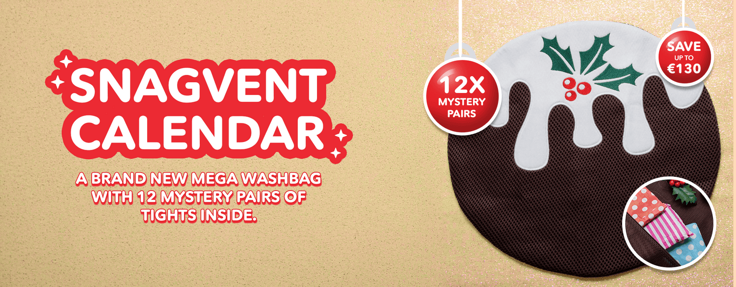 Primo, un nuovissimo sacchetto per il lavaggio del budino di Natale di dimensioni gigantesche. In secondo luogo, 12 paia misteriosi dei nostri collant super comodi. I collant sono stati scelti a mano dai nostri Snag Elves da tutte le nostre precedenti collezioni, quindi quello che riceverete sarà una vera sorpresa!