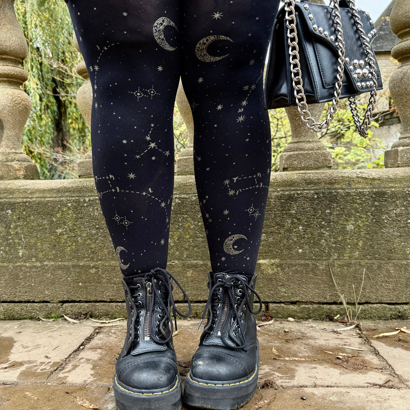 Hallow-queen is de perfecte draagbare panty voor heksen. Een zwarte 80 denier basis met dromerig maan- en sterrenmotief in gouden glitter. Perfect het hele jaar door dankzij het ademende garen. Niet ingraven, niet afrollen of afzakken. Subtiel genoeg om voor alle gelegenheden te dragen, dit is een verborgen juweeltje dat je nodig hebt in je pantycollectie.