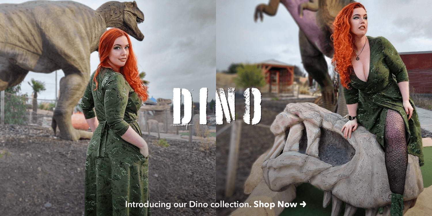 Op fossielen geïnspireerde breisels, retro jurken met een Jurassic twist en statement panty's die je laten stampen van plezier.