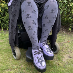 Deze klassieke grijze panty met ingebreide doodshoofden in plaats van opgedrukt is comfortabel genoeg om de hele dag te dragen. Deze panty heeft 12 inch multidimensionale stretch voor een goede pasvorm en rolt niet af dankzij een tailleband die goed blijft zitten. Ze vallen soepel over het lichaam en zien er geweldig uit onder kleding, plus ze zijn heel goed te wassen en gaan slijtage na slijtage mee.