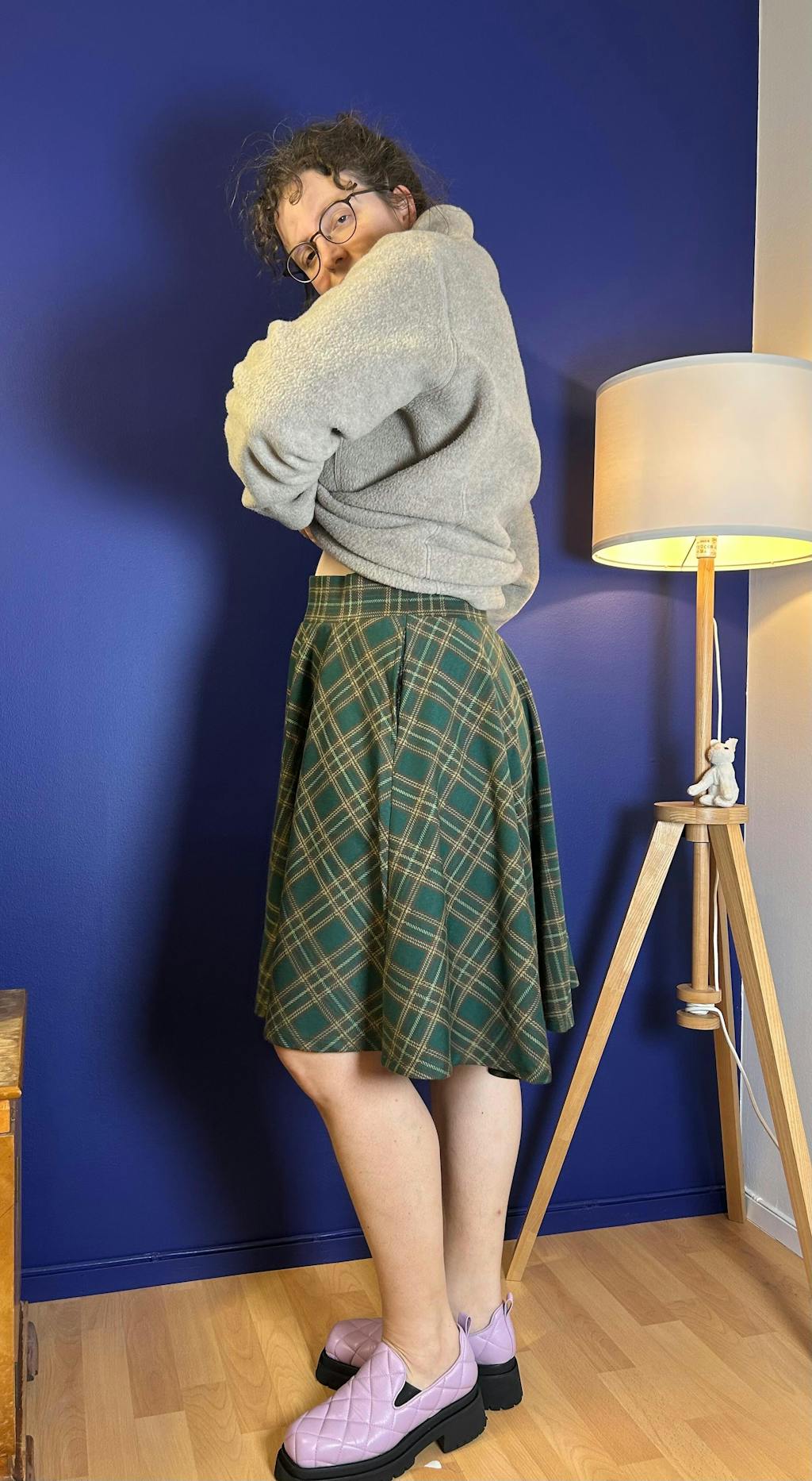 Deze skaterrok valt netjes op de knie en biedt de perfecte balans tussen zwier, bedekking en stijl, met een uitlopende zoom die je bijna uitnodigt om rond te draaien. De rok is gemaakt van superzachte gebreide jacquardstof en voelt net zo goed aan als hij eruitziet. Hij is soepel, comfortabel en valt prachtig, zonder te kleven. Of je nu door je dag heen loopt of gewoon ronddraait omdat het kan, de beweging is puur plezier.