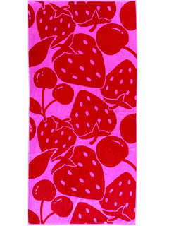Now for the fun bit, Plushie towels have amazing knitted patterns from our very own Snag artworks. Fruity is full of strawberries and cherries, pulled straight from our knitwear, but bigger!
