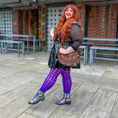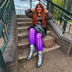 Laat je betoveren door onze nieuwe Checkmate-panty. Deze levendige paarse gemêleerde denier panty heeft speelse geruite patronen die geïnspireerd zijn op kermisattracties. Ze zijn super elastisch en rollen niet af, zakken niet in en houden je de hele dag comfortabel en stijlvol.