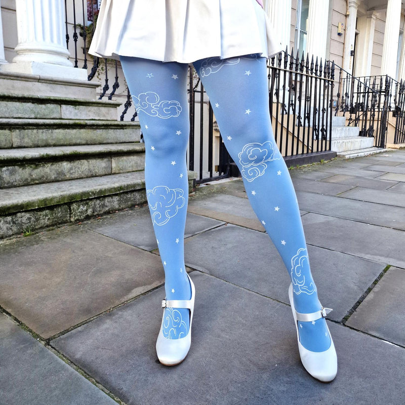 Unosząc się nieco wyżej dzięki rajstopom Woodcut Clouds, w których codzienny komfort łączy się z marzeniami o niebie. Na tle chłodnego, lodowatego błękitu Ice Blast, miękkie białe chmury i rozrzucone gwiazdy dryfują po nogach, a każda chmura jest utworzona z pięknie wyrytych linii, które odzwierciedlają tradycyjną sztukę rzeźbienia w drewnie. Efektem jest wzór, który wydaje się zarówno ponadczasowy, jak i artystyczny, niczym chmury cierpliwie rzeźbione ręcznie w reliefie.