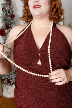 Olśniewaj w sezonie imprezowym dzięki sukience Bordeaux Lurex Halter Dress, Twojej pełnej blasku tajnej broni. Lureks w kolorze głębokiej czerwieni bordo mieni się jak grzane wino w świetle lampek, a jedwabiście miękkie wiązane paski na szyi zapewniają indywidualne dopasowanie, które nigdy nie uwiera. Tańcz od pierwszej kolędy do ostatniego odliczania bez konieczności poprawiania.