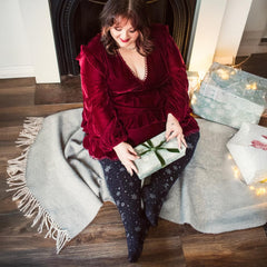 The soft black base gives cosy, opaque coverage, while the shimmering motifs catch the light with every step. Perfect with dresses, skirts, or cosy knits, these tights balance otherworldly sparkle with everyday style. Made with our signature super-stretchy fit, Winter Solstice mould comfortably to your body and stay in place all day. The high waistband sits smoothly without rolling or pinching, and the breathable cotton gusset keeps you fresh from morning to midnight. Soft, durable, and luminous, these tights are ready to light up your winter wardrobe.