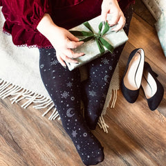 Meet Winter Solstice, the 80 denier black tights that bring the night sky to your wardrobe. Glittering moons, twinkling stars, and delicate snowflakes in mixed sizes create a magical, celestial scene that’s enchanting, elegant, and effortlessly wearable.