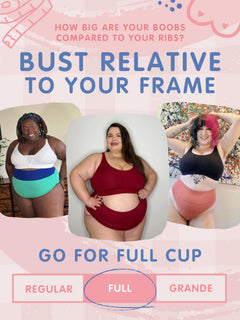 We've listened to feedback and there are now three cup sizes. Regular, Full and Grande. Grande is the latest edition and is tailored to support those with a smaller band-to-cup ratio (how big your boobs are compared to your ribs). For the Grande cup size in the Comfort Cotton Bras, we've included a folded mesh sling for epic support.