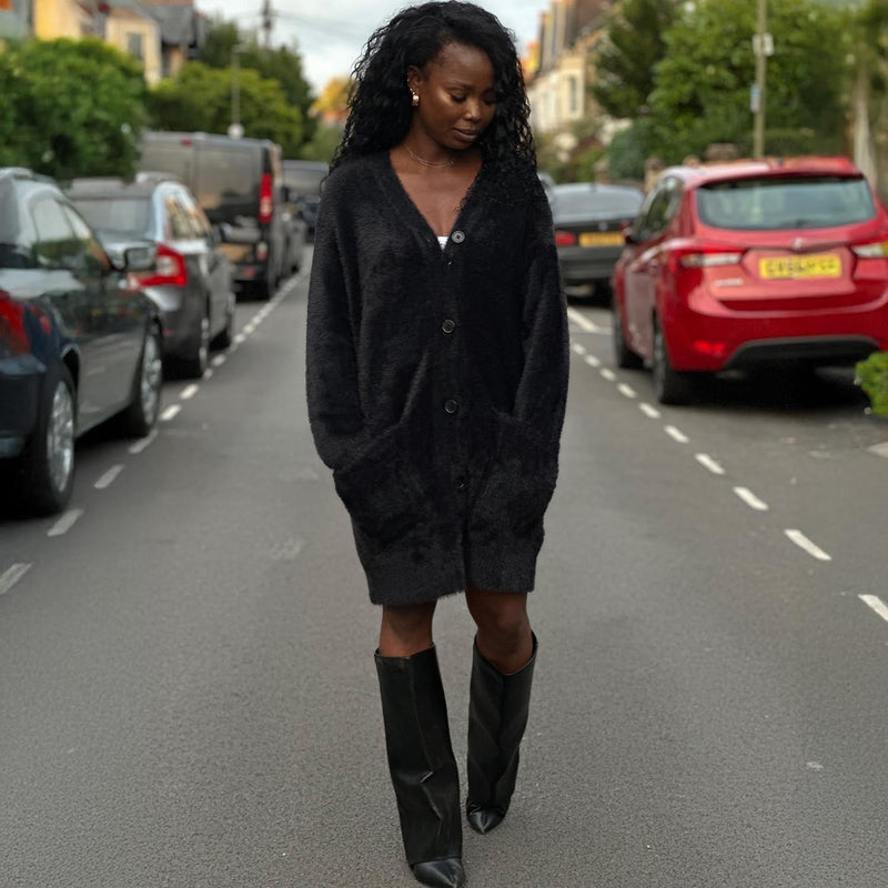 Meet your hero winter layer. The Fluffy Cardigan in Black is the ultimate mix of cosy and chic, ready to smarten up any outfit while keeping you snug. Timeless, versatile and ridiculously comfy, it’s the piece you’ll throw on for school runs, sofa days, nights out and everything in between.