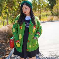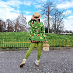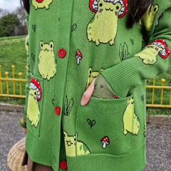 Our Hoppy Meadow Cardigan is guaranteed to make you smile. Set on a grass green background, this statement knit is covered in playful light green frogs, from strawberry-hugging cuties to frogs wearing tiny toadstool hats. Finished with five bright red buttons down the deep green placket, it's packed with joyful details that turn everyday outfits into something special.