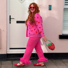 Love Me, the cardigan that wears its heart everywhere. Soft pink and scattered with bold red hearts, this joyful knit is finished with matching patterned pockets and five red buttons down the pink placket. Cut to a flattering bum-covering hip length, it's designed to feel cosy, cute and confidence boosting all at once.