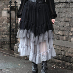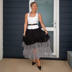 Some pieces don't just turn heads. They cast a spell. The Ombre Mesh Maxi Skirt in Black flows through three smoky shades of light grey, dark grey and deep black, tiered, ethereal and impossible to look away from. Floaty, sheer and full of movement, it catches the light and swishes with every step.