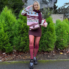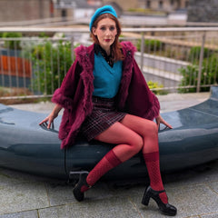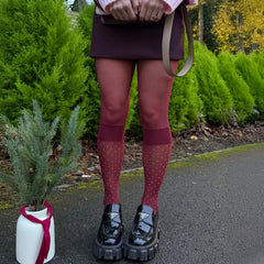 - The Look: These opaque burgundy tights aredesigned to mimic the look of wearing socks over sheer tights, giving you a layered, fashion-forward aesthetic without the bulk.