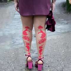 From the front, these tights look soft and barely there. From the back, they tell a whole story. The contrast between the sheer base and the richer denier red print creates a gorgeous leg lengthening effect that feels elegant but never boring. Perfect for slow turns, confident strides and that moment when someone says “wait… your tights!”