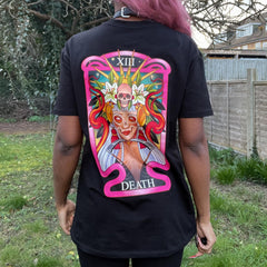 Out with the old. Step into your next chapter. The Unisex Tarot Tee in Death is all about transformation, release and the energy of new beginnings. Featuring our artist's striking interpretation of the Death card, this tee makes a statement from every angle. Clean, classic black from the front. Turn around and it strikes you. Bold, high-contrast artwork that feels alive with meaning and energy.