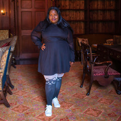 Gatos, sim, collants de gato. Estes collants de 80 denier são brancos da coxa para cima e pretos da coxa para baixo com um design de gato a imitar o joelho.