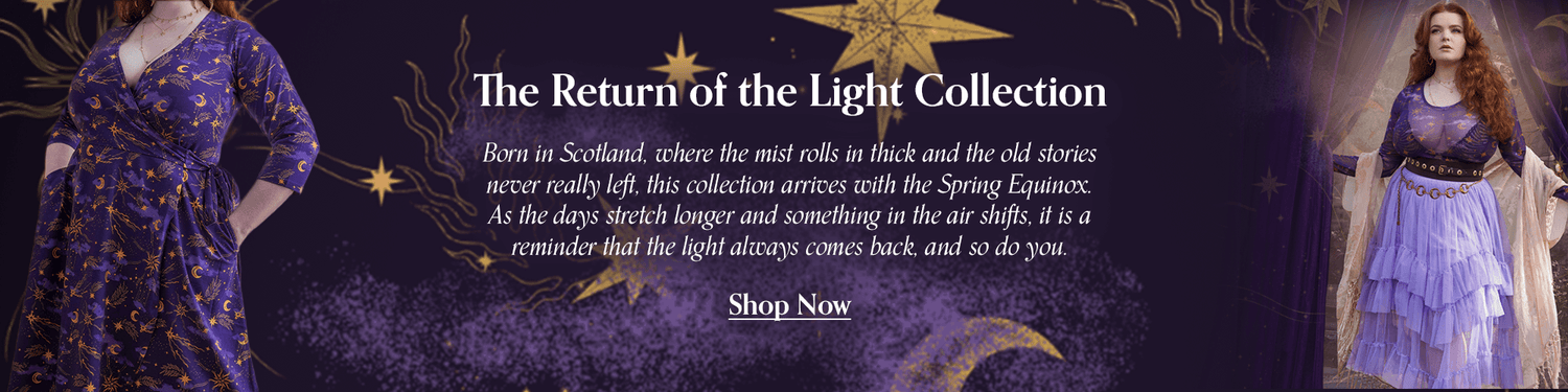Varje plagg i denna kollektion har skapats med just detta i åtanke. Nätkjolar som rör sig som rök. Klänningen Celestial Wrap Dress, som är justerbar och utformad för att passa din kropp i storlekarna 32 till 66. Kläder som känns som en rustning och samtidigt som att komma hem.