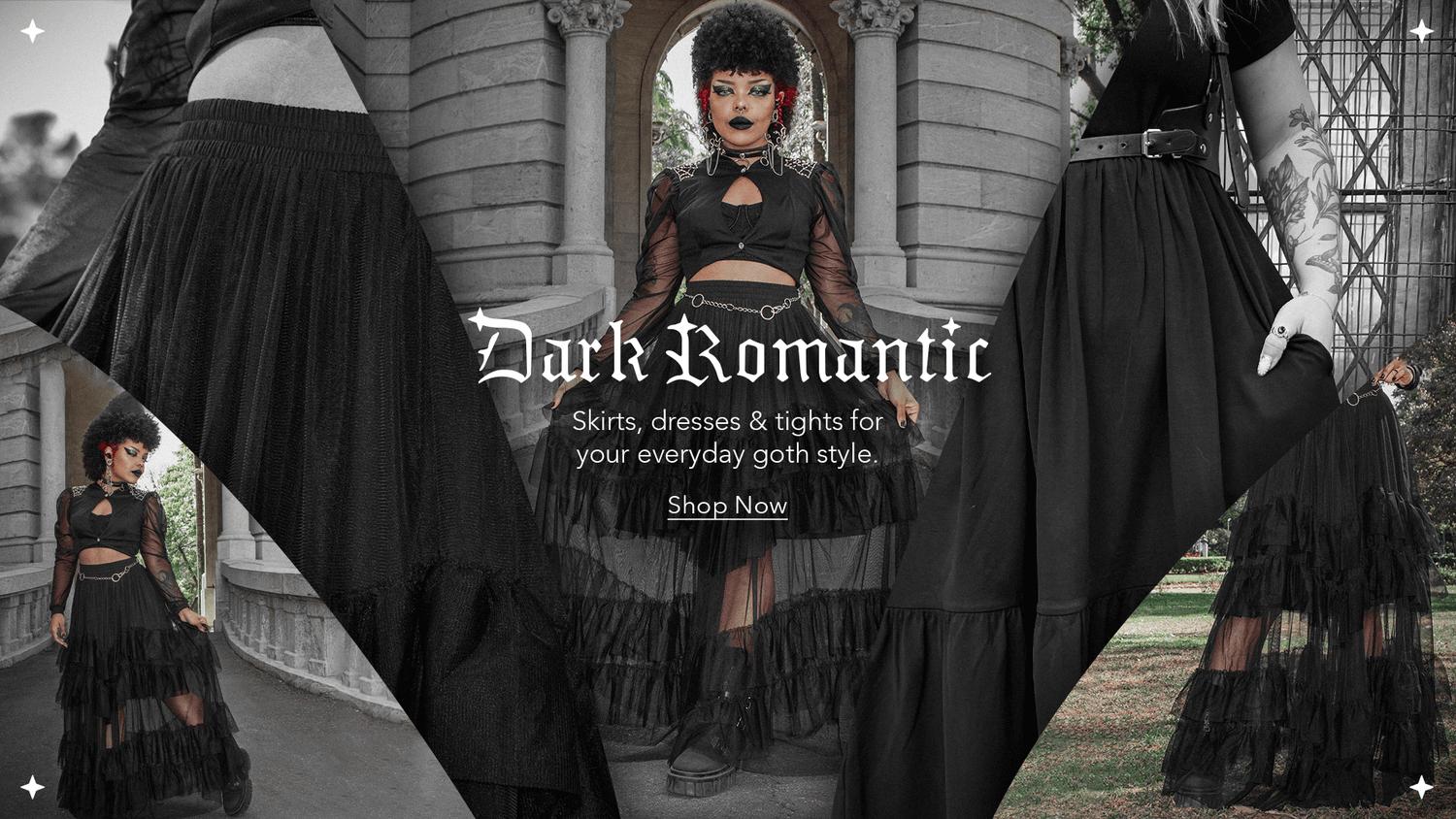 Vår Dark Romantic-kollektion är fullpackad med svarta klänningar, otroliga kjolar och unika alternativa tights, alla designade för att du ska kunna uttrycka dig själv. Med svävande maxikjolar i tyll, klänningar att dö för och nätstrumpbyxor som passar perfekt finns det en kombination här som kommer att stjäla ditt hjärta. Den här kollektionen får liv med en punkig attityd och ett par rejäla stövlar. Goth-essentials i alla storlekar, redo att bli dina egna.