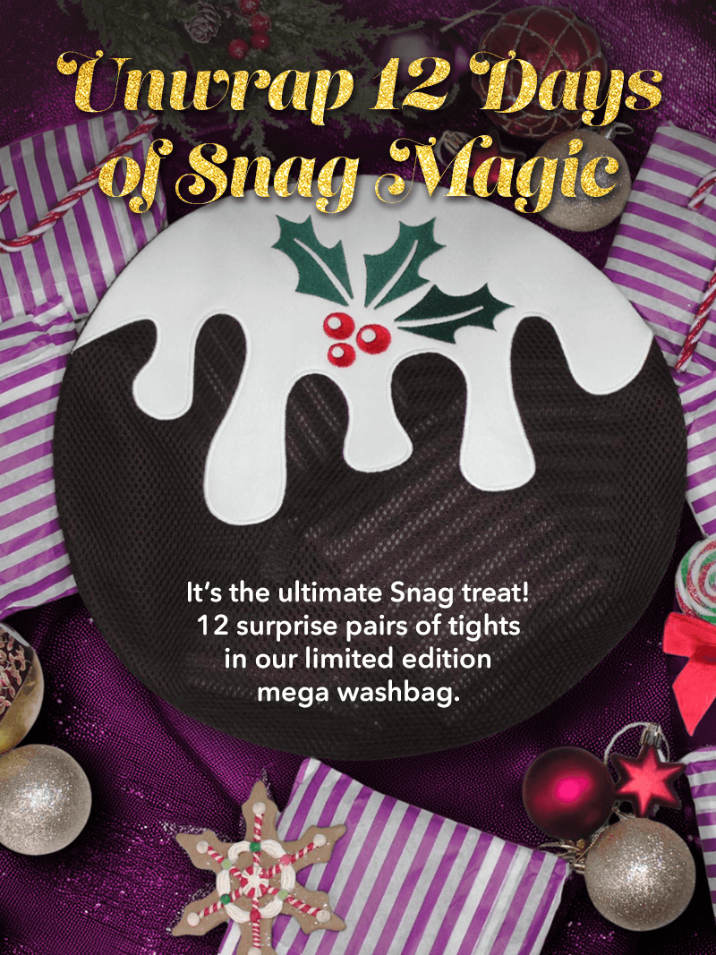 För det första en helt ny, megastor tvättpåse för julpudding. För det andra 12 mystiska par av våra supersköna strumpbyxor. Strumpbyxorna är handplockade av våra Snag Elves från alla våra tidigare kollektioner, så vad du får är en total överraskning!