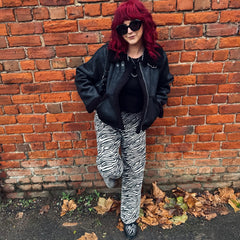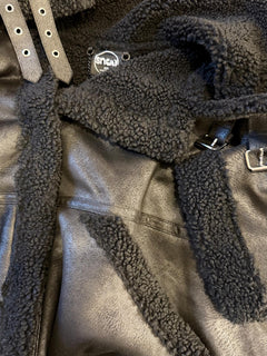 Spänn fast säkerhetsbältet och upplev Bessie Aviator Jacket i svart borg. Denna jacka förmedlar en flygarmässig attityd i en gosig kram. Det är en veganvänlig kort jacka tillverkad av ultramjukt imitationsmocka med plyschig borg-kant på kragen och ärmsluten. Dra upp dragkedjan en gång och du omsluts omedelbart av ren lyx som känns som att stjäla täcket en vintermorgon.